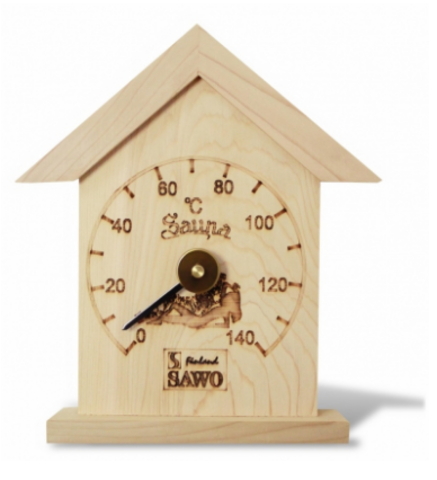 Термометр 115-ТР от компании Sawo имеет необычную форму домика. Выполнен измерительный прибор из древесины сосны. На основу термометра нанесён большой, графичный циферблат, который сообщит о температуре воздуха. Данный прибор прекрасно подойдёт для использования в парной. Максимально допустимая для измерения температура составляет 140 градусов Цельсия. Этого максимума достаточно для комфортных банных процедур. Нагнетание в парном помещении большей температуры нежелательно, так как может быть опасным для здоровья. Благодаря универсальному дизайну термометр станет прекрасным дополнением любого интерьера