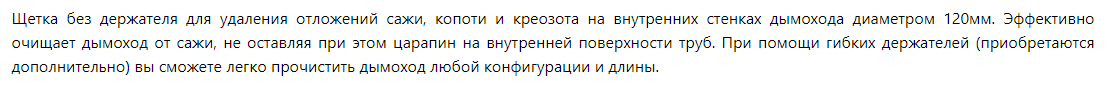 Щетка без держателя для удаления отложений сажи, копоти и креозота на внутренних стенках дымохода диаметром 120мм. Эффективно очищает дымоход от сажи, не оставляя при этом царапин на внутренней поверхности труб. При помощи гибких держателей (приобретаются дополнительно) вы сможете легко прочистить дымоход любой конфигурации и длины.