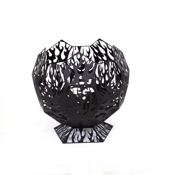 Чаша выполнена из стали толщиной 3,0мм, что позволяет костровищу не деформироваться на всем протяжении использования. Изделию не страшны перепады температур и высокая влажность. Пламя, отбрасывающее тени через отверстия в стенках, будет создавать магическую атмосферу в тёмное время суток. Дизайн очага выполнен в форме сферы, состоящей из пятиугольников. главное достоинство очага – красивый дизайн стенок в виде всполохов пламени. На фоне настоящего огня это создаёт незабываемую игру света и тени.