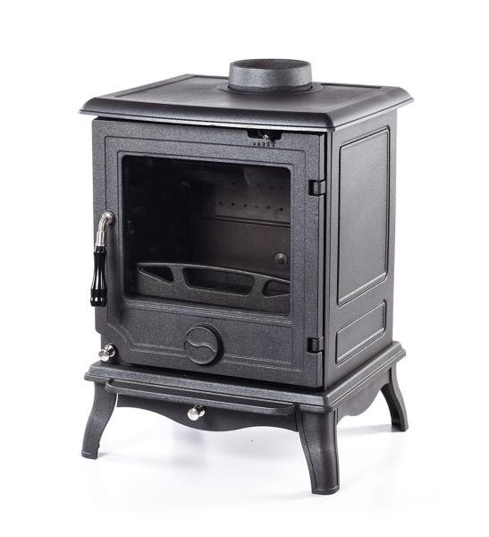 Максимальная тепловая мощность печи 10 кВт. КПД 79%. Систем длительного горения, работа в режиме тления до 8 часов. Система обдува стекла. Загрузка дров фронтальная. Диаметр дымохода 140 мм. Расположение дымохода сверху и сзади. Отделка антрацит. Размер стекла 251х270х4 mm.